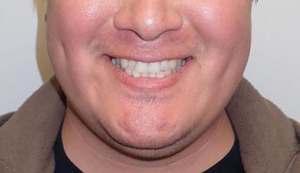 This patient came to us after having previous orthodontic treatment and surgery to reduce pressure on his teeth from his gums (frenectomy), after which the diastema — the space between his front teeth — had opened back up. Using Invisalign, we closed that space, and now he is very pleased with his smile and loves showing it off whenever he can!