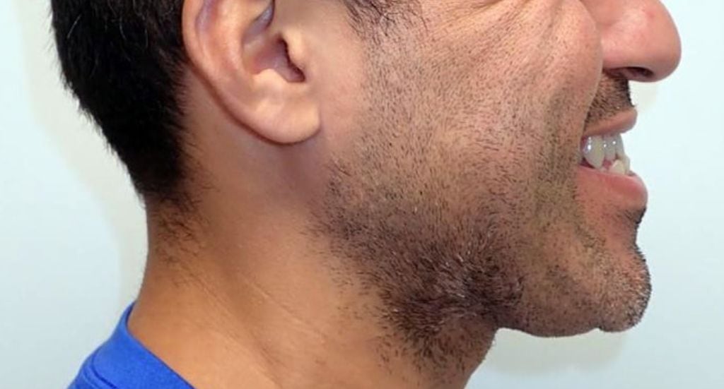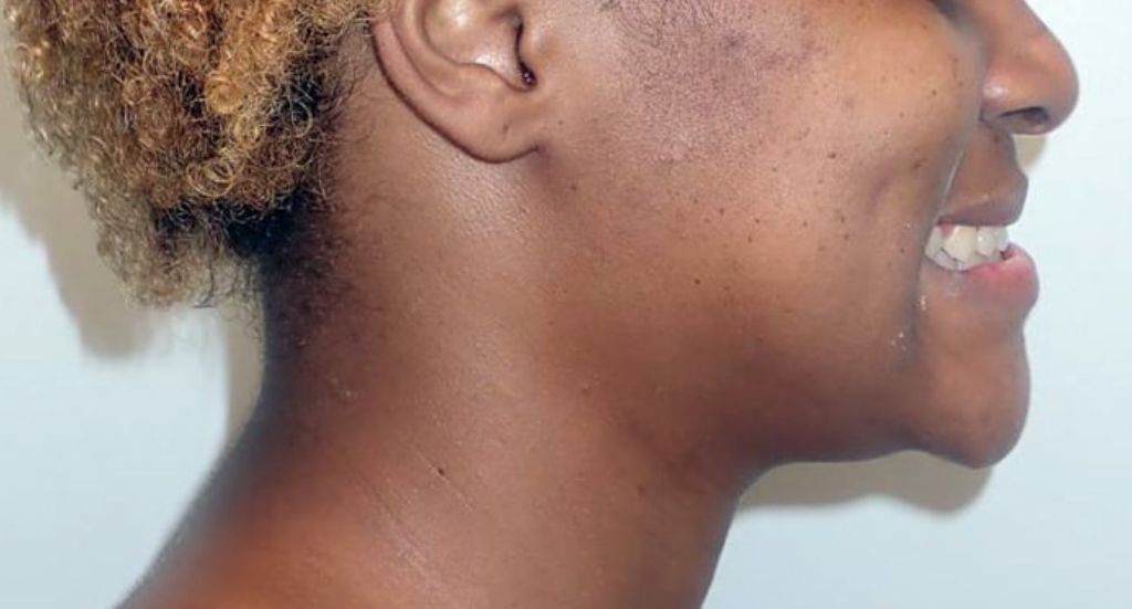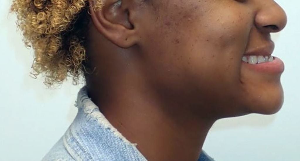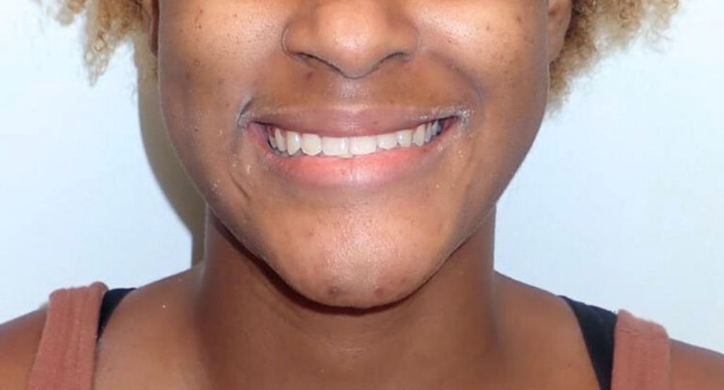 The patient’s underbite was resolved; they were thrilled with their new smile and improved facial structure.